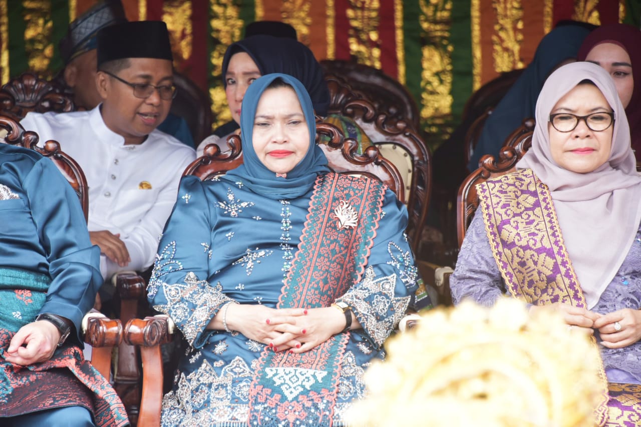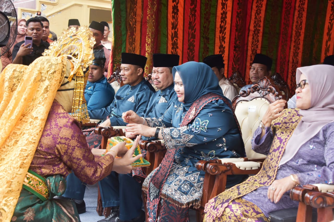 Usai melewati jajaran bunga manggar, rombongan Bupati Kasmarni yang didampingi Wakil Bupati dan Bupati ke-14 Bengkalis Amril Mukminin dan unsur Forkopimda Kabupaten Bengkalis dan diapit oleh bujang dan dara