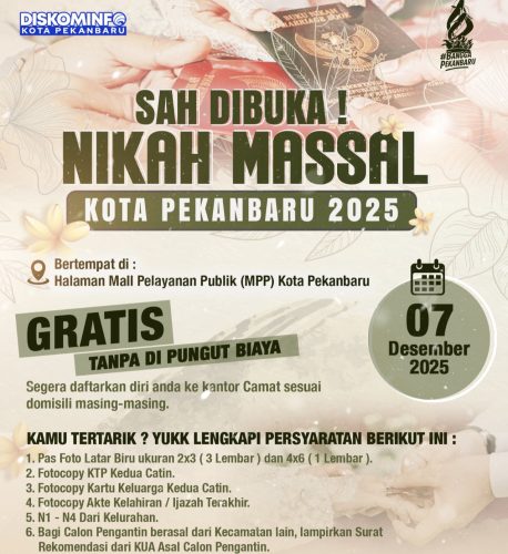 Wali Kota Pekanbaru, H. Agung Nugroho, SE, MM, mengatakan kegiatan nikah massal gratis itu dijadwalkan berlangsung pada 7 Desember 2025 mendatang di kompleks Mal Pelayanan Publik (MPP) Jalan Jenderal Sudirman.